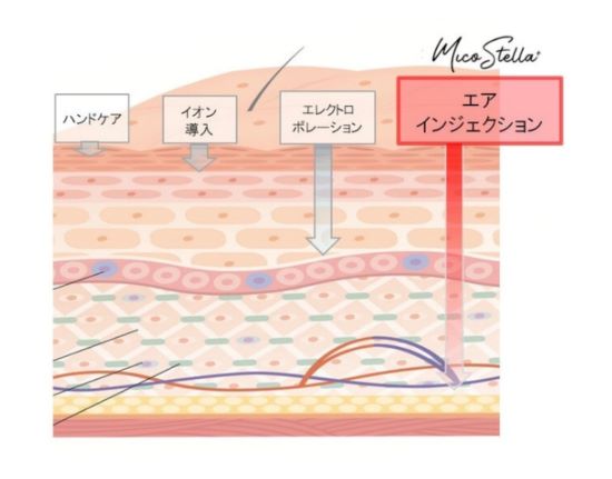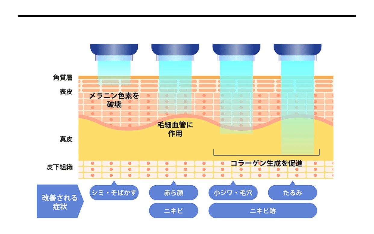 ・特殊な光がシミやくすみの原因であるメラニンに刺激を与え、お肌のターンオーバーによって剥がれおち シミやくすみが薄くなりお肌が明るくなります。同時にコーラゲンなどの産生も促進されます。