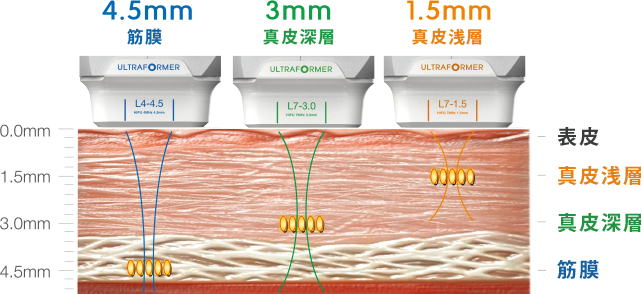お口まわりの改善に筋膜まで届く4.5mmを 真皮までには3mm 繊細な部位には1.5mmのカートリッジを使用します。(点状式)